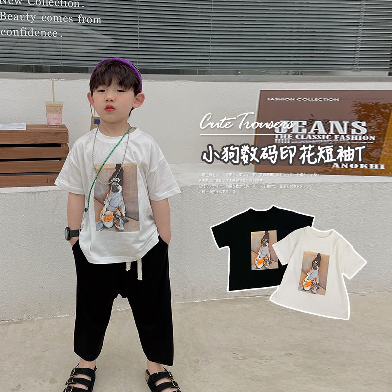 儿童洋气小狗数码印花圆领短袖t恤衫潮夏季日系男童宽松全棉上衣热门设计联盟服务商