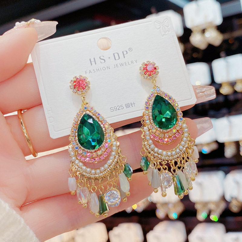 2021秋冬新款时尚复古绿水晶水滴型流苏耳坠个性轻奢独特设计耳环热门设计联盟服务商